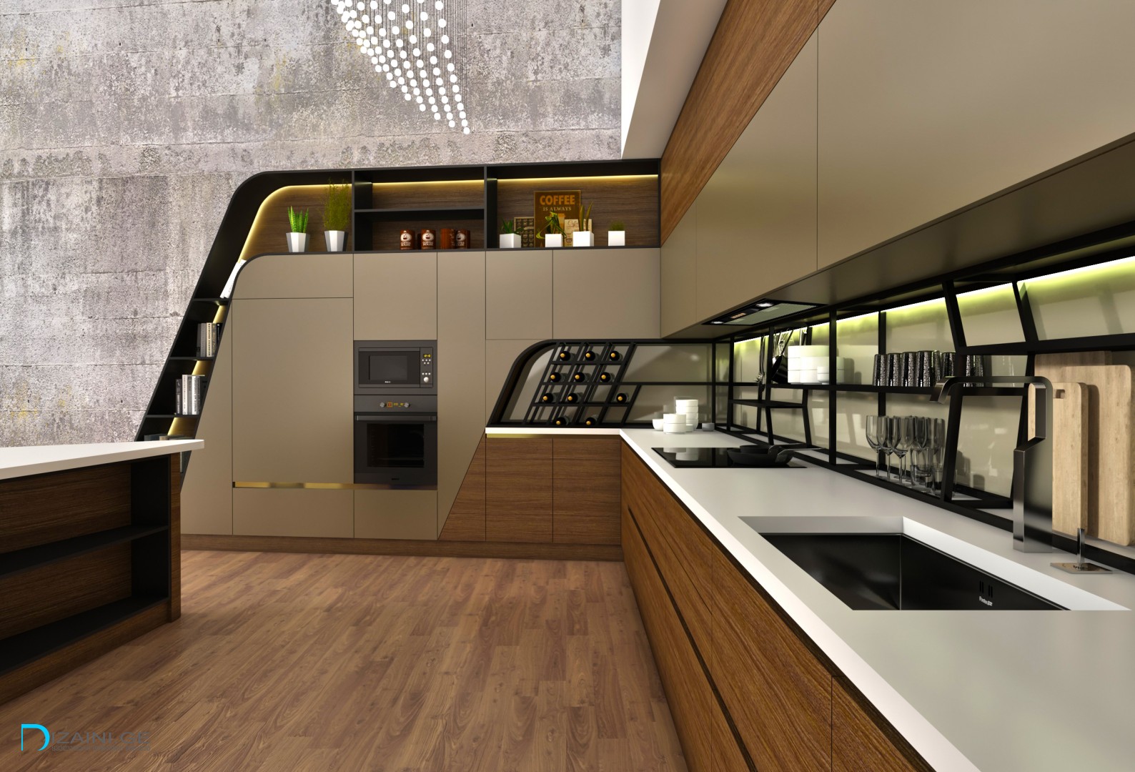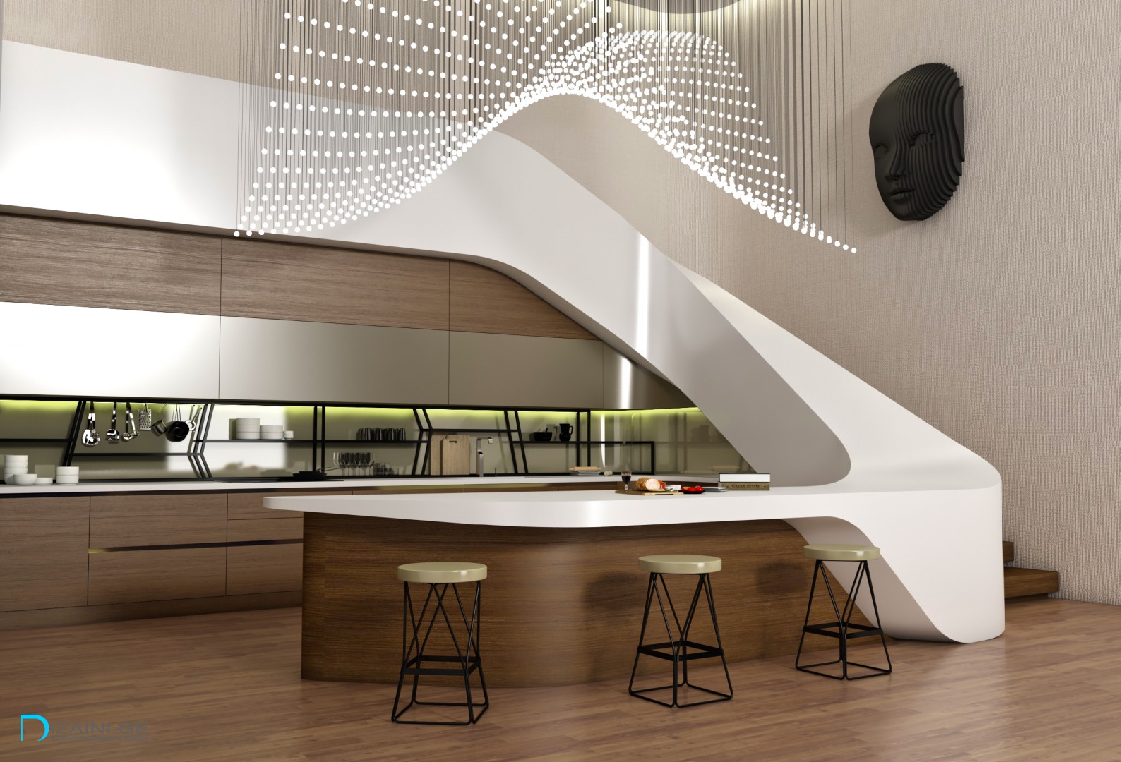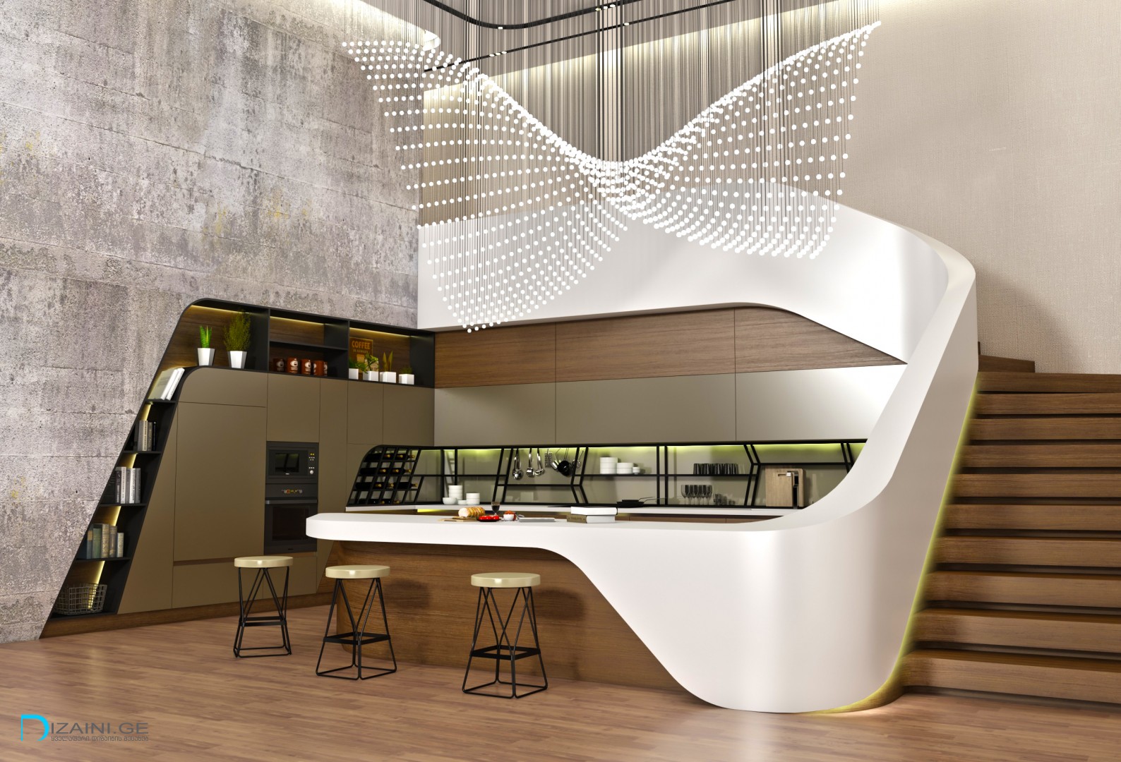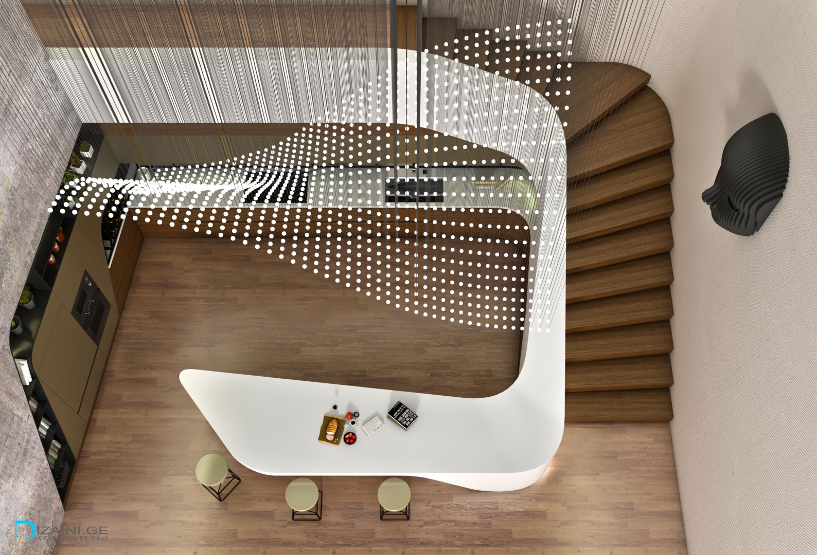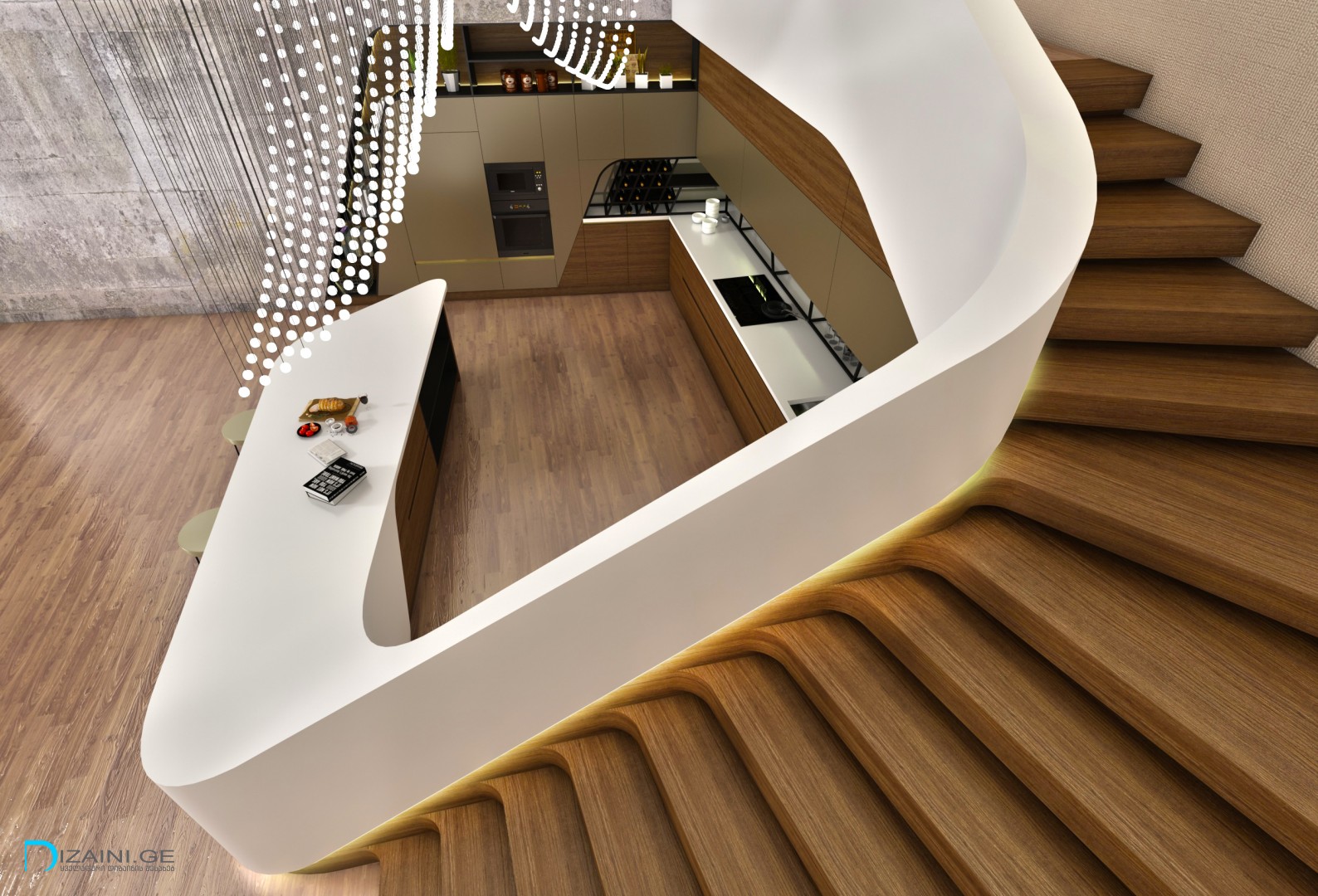 თანამედროვე სტილის სამზარეულოს დიზაინი დუპლექსის ტიპის ბინაში
